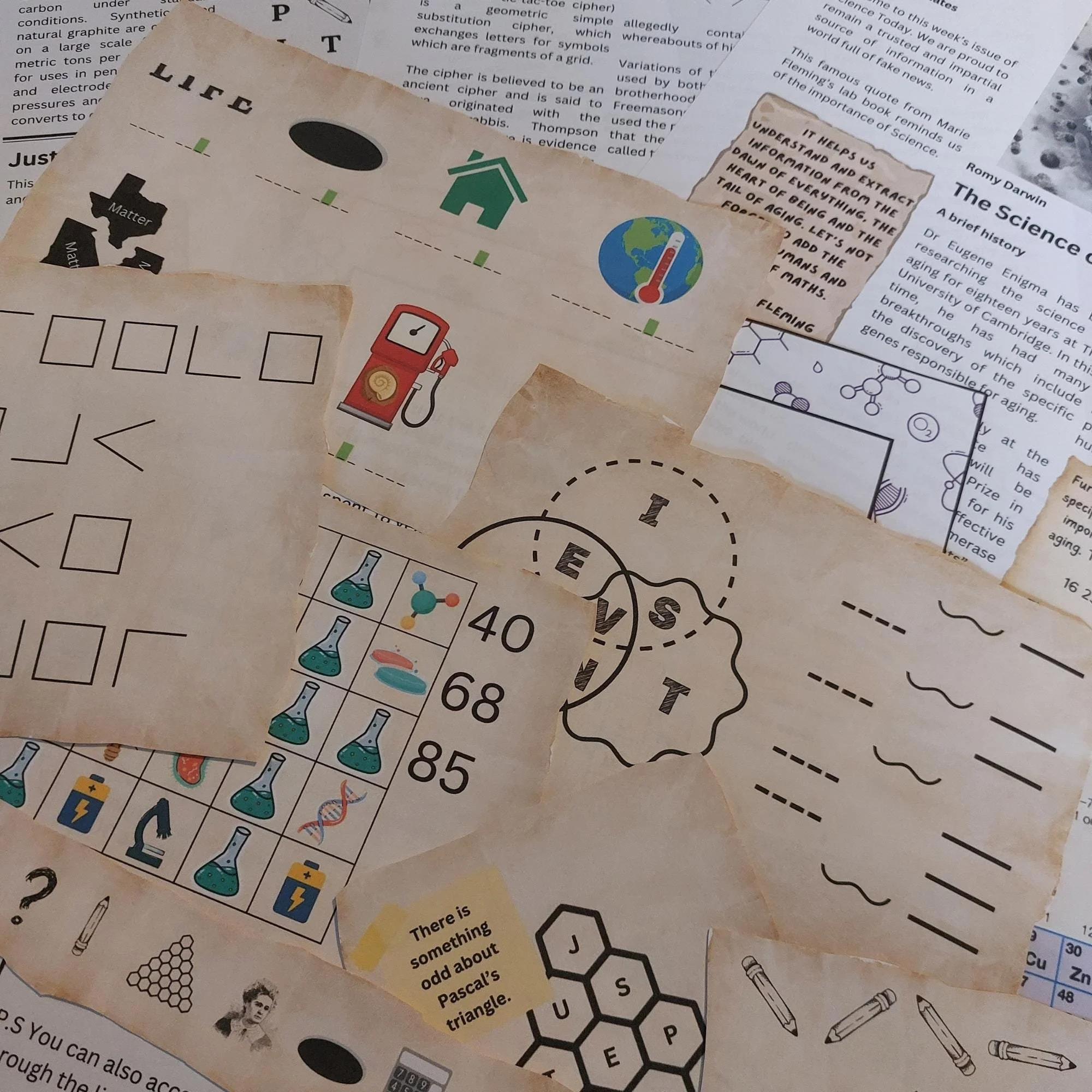 You see an envelope on one of the lab benches with a note informing you you must solve the puzzles enclosed to find the code to unlock the door and escape.